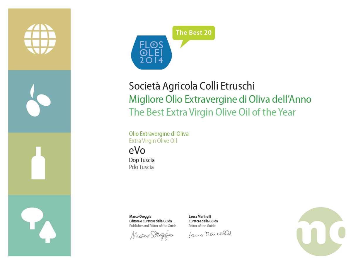 Personalitate puternică, perla Colli Etruschi este un ulei de măsline bogat în polifenoli, cu un gust distinct și premii pe măsură: Cel mai bun ulei de măsline extravirgin din lume, Flos Olei, 2014 și Cel mai bun ulei D.O.P. din Italia, Gambero Rosso, 2023. Intens, cu note de iarbă proaspăt cosită, anghinare, verde crud astringent, piperat și catifelat, exprimă puterea naturii. Îmbogățește orice atinge, legumele verzi, peștele crud ori rumenit, pastele aburinde, vlăstarii, roșiile cu brânză și pâinea proaspătă.